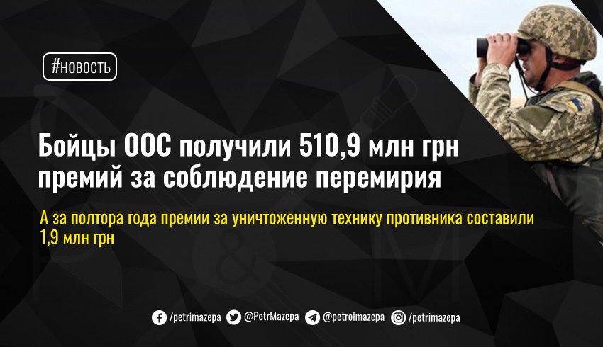 С начала перемирия (27 июля) по 1 декабря, военным за «правильные» действия выплачено вознаграждения на сумму 510,9 млн гривен. Премию бойцы и командиры получили за соблюдение перемирия.