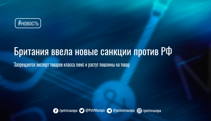 "Правительство Великобритании сегодня объявило о запрете на экспорт в Россию высококачественных товаров класса люкс, а также ввело новые импортные тарифы на сотни ключевых товаров, которые на 35 процентных пунктов повысили текущие ставки", - цитирует сообщение британского правительства «Европейская правда».