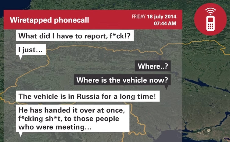 В дальнейшем следствие представляет перехваты телефонных переговоров, сделанные утром после сбития. Некоторые участники этих переговоров до сих пор не установлены, однако по крайней мере один из них — россиянин Сергей Дубинский, бывший глава разведки «министра обороны ДНР» Игоря «Стрелкова» Гиркина. В ходе этих переговоров Дубинский и другие описывают, как «Бук» перевезли назад в Россию и оставили с некими «парнями».