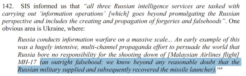 На странице 52 отчёта, где описаны российские мероприятия по дезинформации, источник из Секретной разведывательной службы поясняет, что «мы без каких-либо разумных сомнений знаем, что ракетную установку поставили, а после сбития MH17 — эвакуировали российские военные».