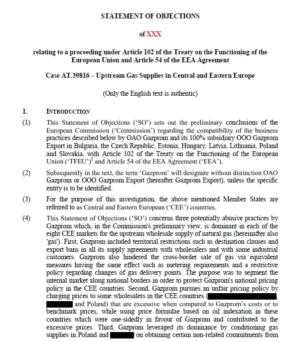 Несмотря на то, что 271-страничный документ подвергся сильному редактированию, вывод ясен: «Газпром преследует стратегию сегментации рынка в странах Центральной и Восточной Европы через территориальные контрактные ограничения и подобные меры».