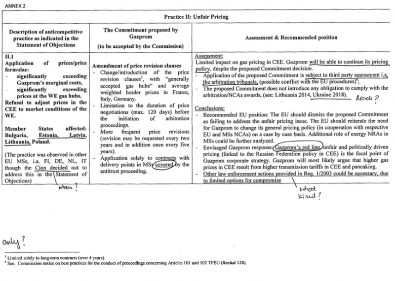 В одном из утёкших в сеть документов представлен взгляд некоего не поддающегося идентификации источника в аппарате ЕС на предложения Газпрома по урегулированию спора. Там говорится, что предложение Газпрома позволит компании «сохранить свою ценовую политику» и не предотвратит дальнейшие злоупотребления.