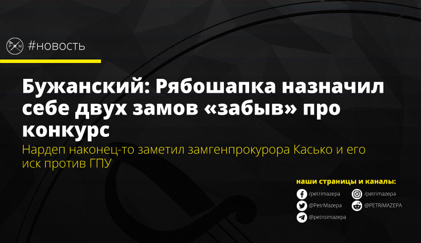 Нардеп от «Слуги народа» Максим Бужанский сообщил, что Генеральный прокурор Руслан Рябошапка назначил себе двух заместителей «забыв» при этом о проведении конкурса. Более того – нардеп теперь заметил на должности замгенпрокурора Виталия Касько, который все еще судится против ГПУ, хотя там уже снова работает.