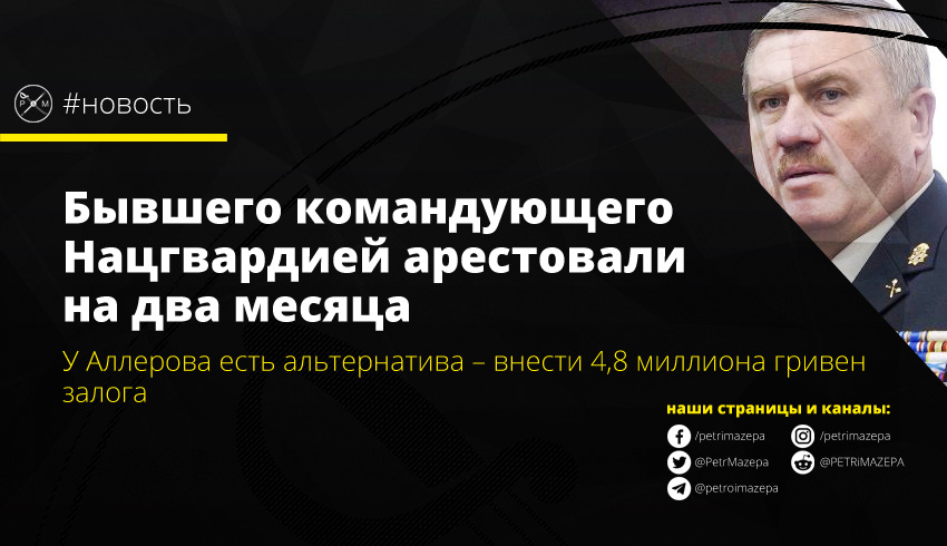 В Соломенском райсуде Киева решили, что бывшего командующего Национальной гвардии Украины Юрия Аллерова стоит арестовать на два месяца, если он не согласен внести в 4,8 миллиона гривен залога. Аллеров подозревается в завладении почти 82 миллионами гривен при обмене квартир для военных.