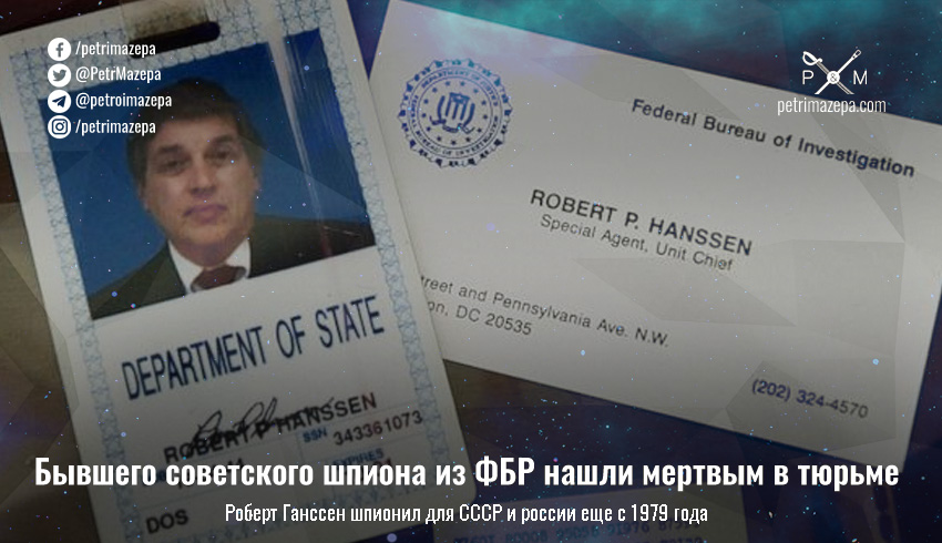 Бывшего контрразведчика ФБР и российского агента Роберта Ганссена нашли мертвым в тюрьме в штате Колорадо, где он отбывал пожизненный срок. Ныне умерший агент работал на КГБ, а затем на Службу внешней разведки россии с 1979 по 2001-й.