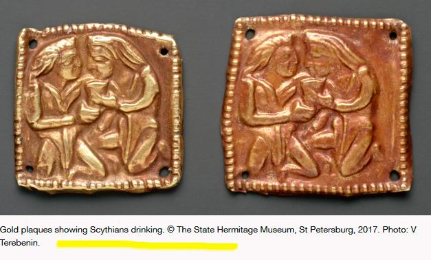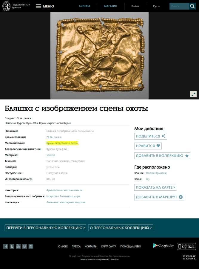 Росіяни у своїх фантазіях зайшли так далеко, що подали в експозиції предмети не лише із захопленого Криму, а й материкової України. Пластини зі сценою братання скіфів, Курган Солоха, Запорізька область, Україна. Розкопки М.І.Веселовського, 1913 р. Знаходиться в Ермітажі (Санкт-Петербург, Росія).