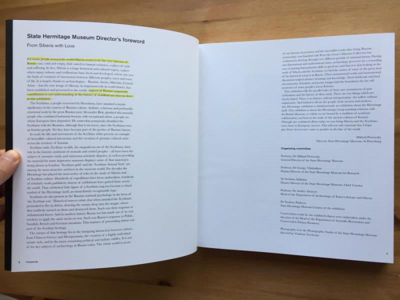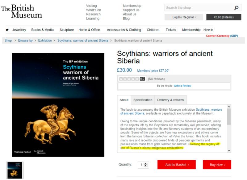 У кращих російських традиціях сфальсифікована історія видається за правду. Тож у чудовому каталозі виставки жодної згадки про український контекст скіфів. Замість цього в анотації згадано лише Росію і Сибір, що створює хибне уявлення про походження цих безцінних скарбів скіфів: