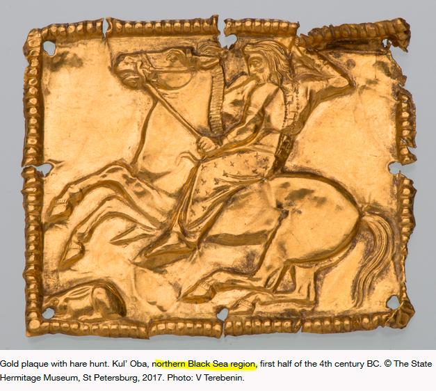 Золота пластина зі сценою полювання на зайця. Той самий курган Куль-Оба у Криму. Підписано як Північне Причорномор’я (northern Black Sea region). Очевидно, що це не халатність, а продуманий системний підхід. Уникнення згадок про Крим і Україну є свідомою маніпуляцією. На сайті Ермітажу всі українські знахідки теж вказані без країни походження.