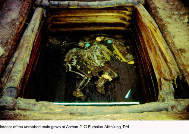 Знахідки в Республіці Тива відносять до ранньоскіфських. Історія курганів Аржан і Аржан-2 є дуже цікавою. На початку 2000-х було зроблено сенсаційне відкриття — абсолютно ціле ранньоскіфське «царське» поховання (VII ст. до н. е.). Скарби, звісно, були перевезені до Санкт-Петербурга в Ермітаж. Лише через багато років більшу частину знахідок тувинці змогли повернути собі в Тиву, де спеціально для цього збудували музей у місті Кизил. До слова, Тува увійшла в Радянський Союз тільки в 1944 році, а сьогодні це Республіка Тива у складі РФ. Тож про яку російськість можна говорити при вивченні курганів Аржан?