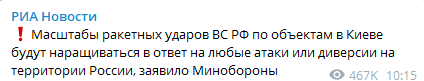 Об этом напрямую заявили в министерстве обороны россии — в ответ на любые события, которые россияне назовут «атаками и диверсиями» со стороны Украины, они обещают «наращивать масштабы ракетных ударов по объектам в Киеве».