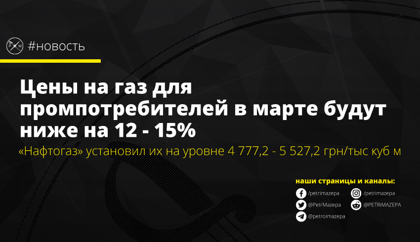 НАК «Нафтогаз» снизила на март цены на природный газ для промышленных потребителей и учреждений, финансируемых из государственного бюджета, на 12-15%. Соответственно цена за газ составит до 4 777,2 - 5 527,2 гривен/тыс куб м (все цены указаны с НДС) в зависимости от условий потребления и оплаты.