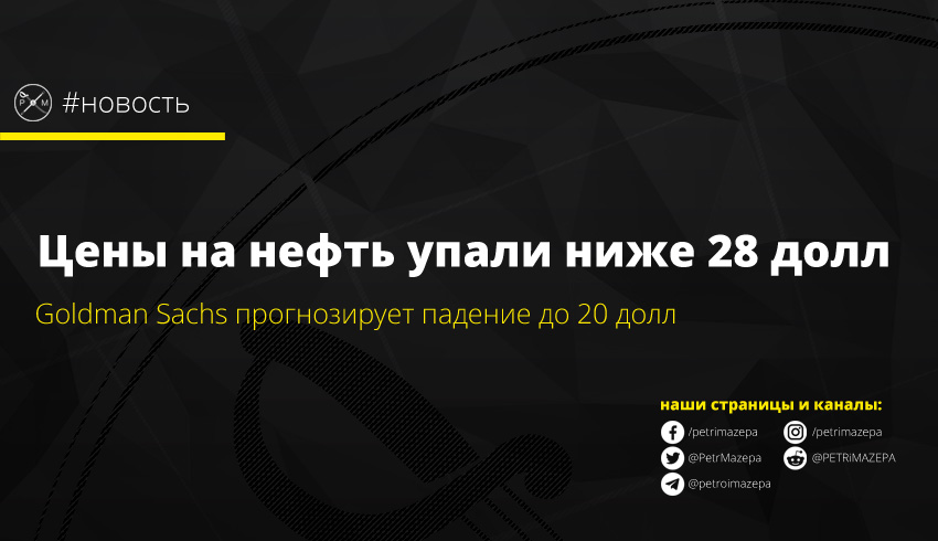 Мировые цены на нефть ускорили темпы снижения на 3 – 5%. По прогнозам Goldman Sachs снижение цен на нефть может достигнуть отметки 20 долларов за баррель.