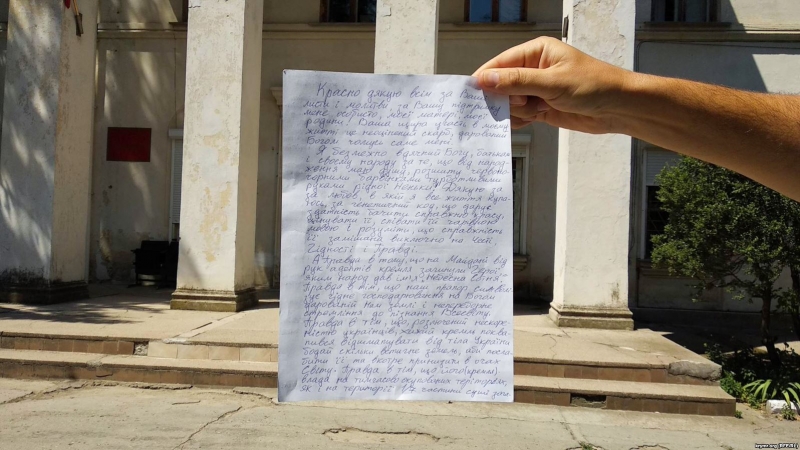 «Это Володя передал всем вам слова благодарности за всё, что вы все сделали для него. Говорить он во время оглашения не имел права, поэтому вот — на бумаге», — поясняет Ольга Динзе.