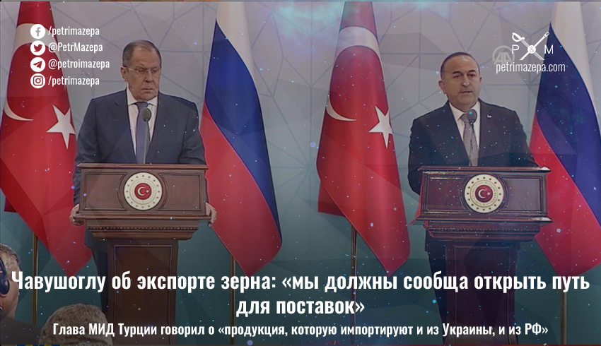 «В вопросе "зернового коридора", мы обсуждаем механизм с участием ООН, РФ, Украины и Турции. Если есть продукция, которую мировые страны импортируют и из Украины, и из РФ, мы должны сообща открыть путь для поставок», — цитирует Чавушоглу агентство «Анадолу».