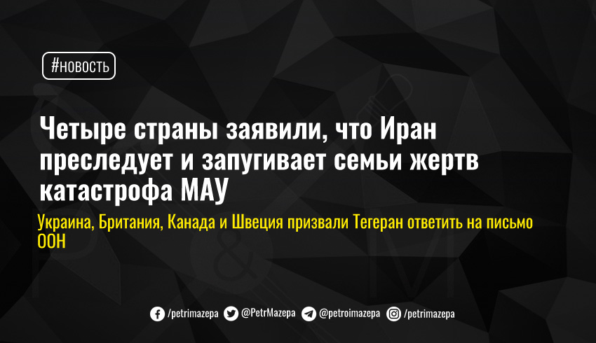 Украина присоединилась к совместному заявлению Великобритании, Канады и Швеции относительно сбитого Ираном самолета украинской авиакомпании МАУ рейса PS752. В своем заявлении страны призвали Тегеран прекратить преследовать и запугивать семьи жертв авиакатастрофы и ответить на письмо ООН, отправленное в феврале.