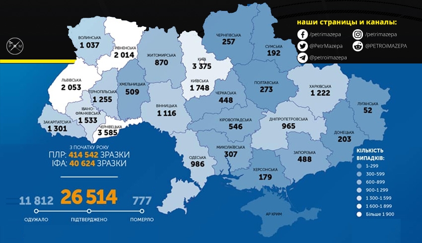 По состоянию на сегодняшнее утро в Украине зафиксировано 26514 случаев коронавирусной болезни COVID-19 – за сутки обнаружено 550 новых случаев. Всего из них 777 летальных, 11812 пациентов выздоровели. При этом число выздоровевших за сутки составило меньше чем обнаружено новых случаев – всего 440.