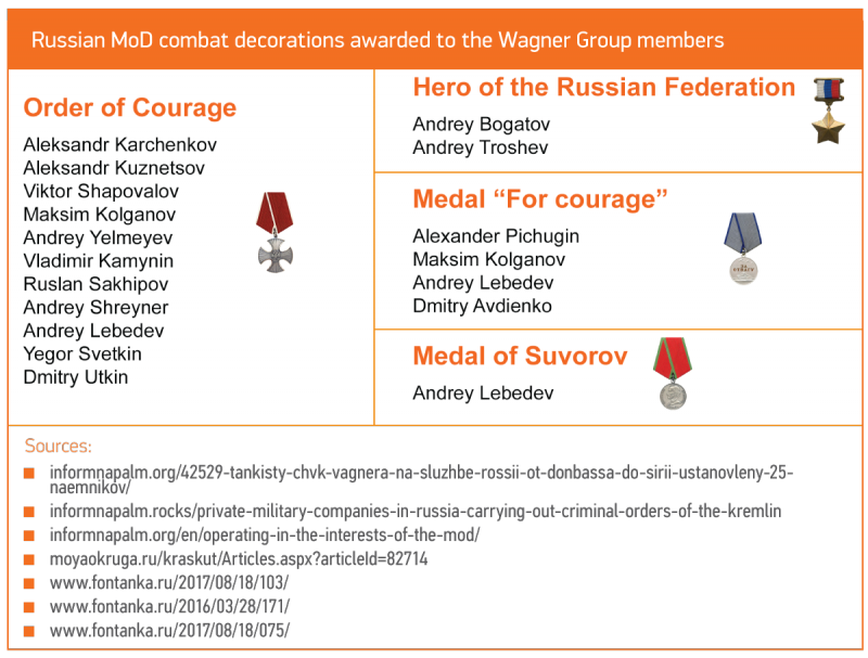 Можно возразить, что «Золотая звезда» Героя Российской Федерации, Орден мужества и Медаль «За отвагу» могут вручаться и гражданским лицам, но дополнительные данные, полученные журналистами в ходе расследований, указывают, что вагнеровцы получали награды именно за участие в боевых действиях. Тот факт, что командиры ЧВК «Вагнер» присутствовали на официальном приёме в Кремле 9 декабря 2016 года и даже фотографировались с Путиным [15], делает тёплые отношения между этой наёмнической структурой и российским правительством ещё более очевидными.