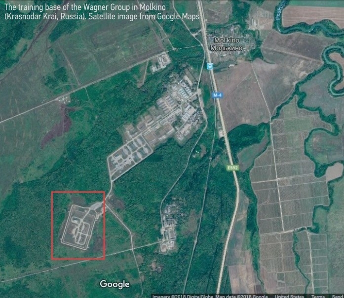 Эта странная практика российского министерства обороны передавать военную технику организации, которая называет себя частной военной компанией, — не единственное связующее звено. Многочисленные сообщения указывают, что основная учебная база «Вагнера» находится в селе Молькино Краснодарского края (Россия) рядом с в/ч 51532, которая принадлежит российской 10-й бригаде специального назначения Главного разведывательного управления Генерального штаба РФ (ГРУ ГШ РФ) [9, 10]. Местные жители утверждают, что на этом режимном объекте наёмников Вагнера готовят к участию в боевых операциях в Украине, Сирии и с недавних пор в Африке. Объект работает уже порядка 5 лет, и эта близость незаконных отрядов наёмников, похоже, никак не беспокоит командование 10-й бригады, правоохранительные органы, местные власти и служащих МО РФ.