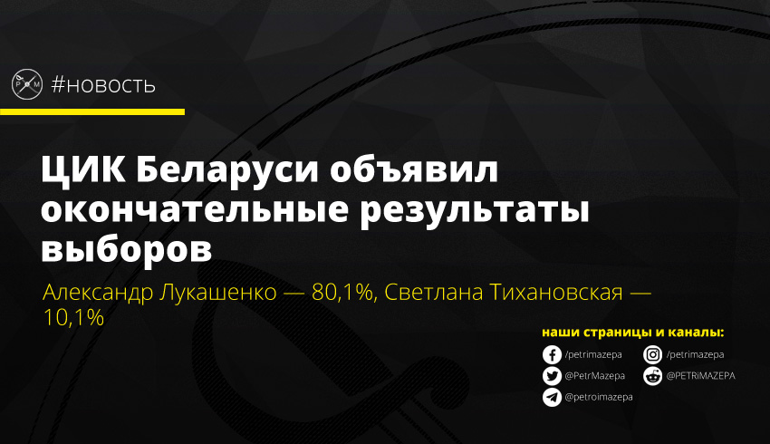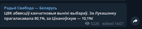 В «Радио Свобода» уточняют, что были объявлены следующие результаты: Александр Лукашенко — 80,1%, Светлана Тихановская — 10,1%