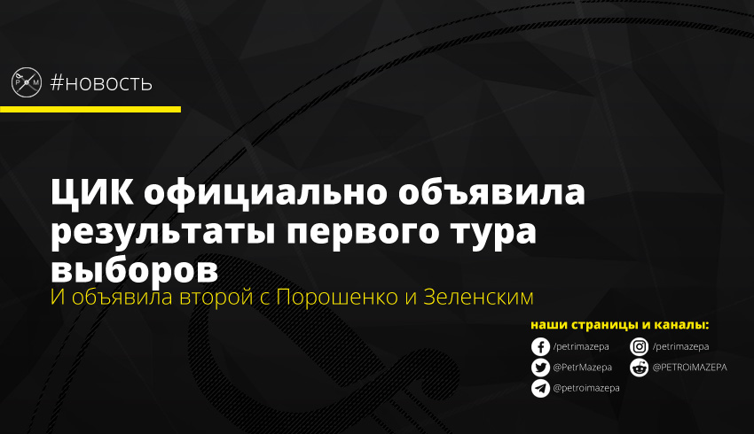 Центральная избирательная комиссия (ЦИК) провела заседание, на котором объявила окончательные результаты первого тура выборов Президента Украины. Согласно данным обработки всех бумажных протоколов голосования на президентских выборах от окружных избирательных комиссий, во второй тур вышли действующий глава государства Петр Порошенко, баллотирующийся на второй срок, и кандидат в президенты, шоумен Владимир Зеленский.