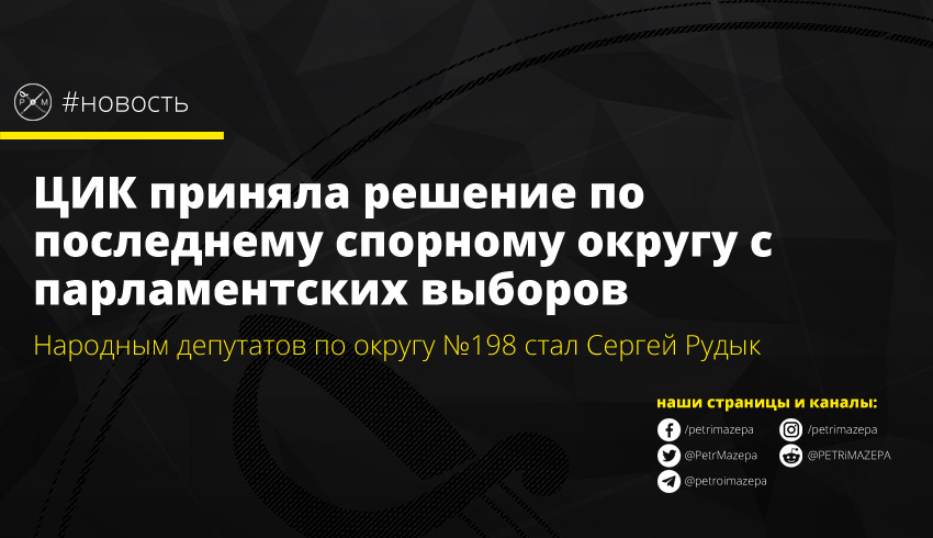 После повторного установления результатов голосования в спорном одномандатном избирательном округе №198 в Черкасской области, ЦИК признала избранным депутатом Верховной Рады Сергея Рудыка.