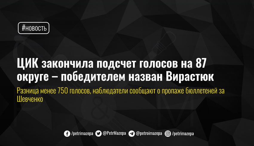 На 87-м округе завершился подсчет голосов – согласно данным Центральной избирательной комиссии, лидером голосования является кандидат от «Слуги народа» Василий Вирастюк. Разрыв между ним и кандидатом на втором месте, Александром Шевченко, составляет менее 750 голосов, и наблюдатели сообщают о несовпадении данных протоколов и данных пересчета при голосовании за кандидата «За майбутне».