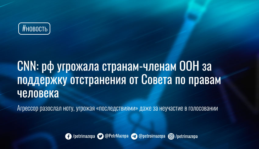 Страна-агрессор разослала ноту государствам-членам Организации объединенных наций, в которой угрожала «последствиями» за поддержку инициативы по исключению россии из Совета по правам человека, и даже за неучастие в голосовании.