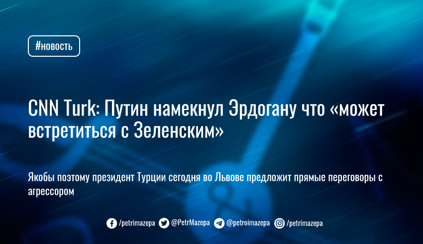 Сегодня во Львове состоится трехсторонний саммит при участии президента Турции Реджепа Тайипа Эрдогана, президента Украины Владимира Зеленского и генерального секретаря ООН Антониу Гутерриша. По данным турецких СМИ, Эрдоган на саммите предложит Зеленскому прямые переговоры с главой страны-агрессора.