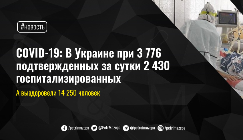 В Украине за сутки официально подтвердили 3 776 (1 200 8383 с начала пандемии) новых случаев коронавирусной болезни COVID-19. При этом, госпитализировано за те же сутки было 2430 «ковидных» больных.