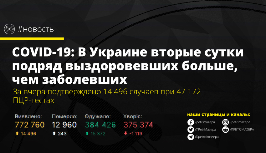 COVID-19: В Украине вторые сутки подряд выздоровевших больше, чем заболевших