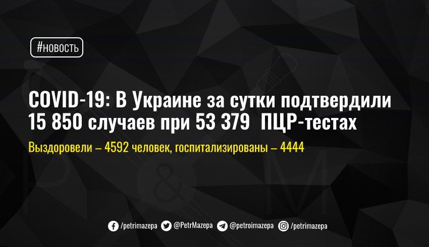 COVID-19: В Украине за сутки подтвердили 15 850 случаев при 53 379 ПЦР-тестах