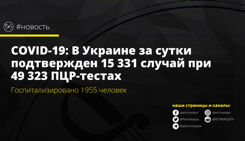 COVID-19: В Украине за сутки подтвержден 15 331 случай при 49 323 ПЦР-тестах