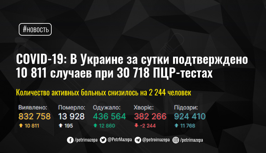 COVID-19: В Украине за сутки подтверждено 10 811 случаев при 30 718 ПЦР-тестах