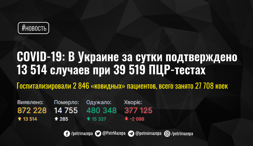COVID-19: В Украине за сутки подтверждено 13 514 случаев при 39 519 ПЦР-тестах