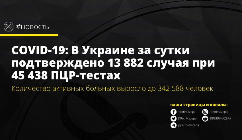 COVID-19: В Украине за сутки подтверждено 13 882 случая при 45 438 ПЦР-тестах
