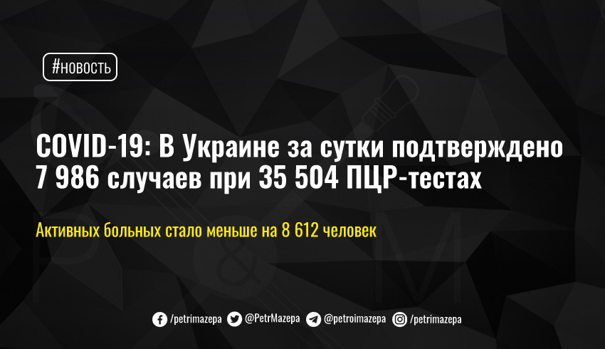 COVID-19: В Украине за сутки подтверждено 7 986 случаев при 35 504 ПЦР-тестах