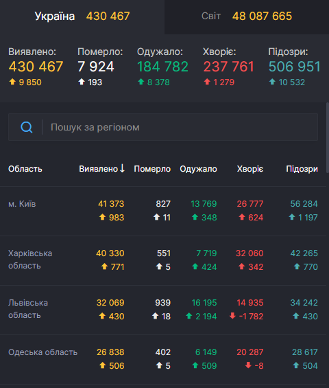 За 4 ноября в Украине зафиксировано 9850 новых случаев коронавирусной болезни COVID-19 (всего с начала пандемии 430 467 человек). Выздоровели- 8378 человек (184 782 с начала пандемии), а летальных случаев – 193 за сутки (7924).