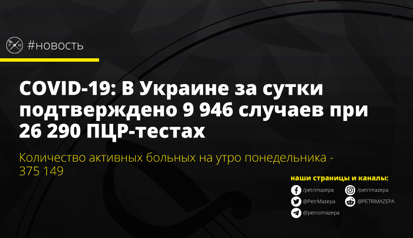 COVID-19: В Украине за сутки подтверждено 9 946 случаев при 26 290 ПЦР-тестах