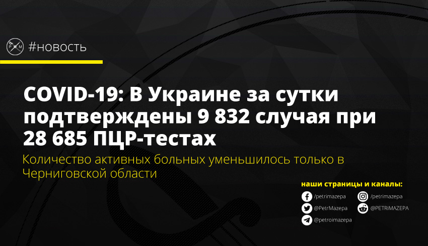 COVID-19: В Украине за сутки подтверждены 9 832 случая при 28 685 ПЦР-тестах