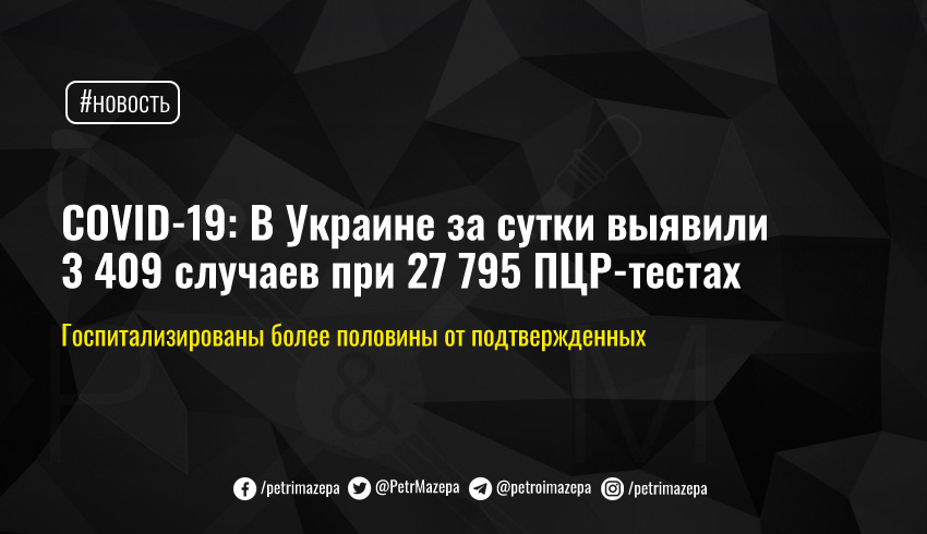 COVID-19: В Украине за сутки выявили 3409 случаев при 27 795 ПЦР-тестах