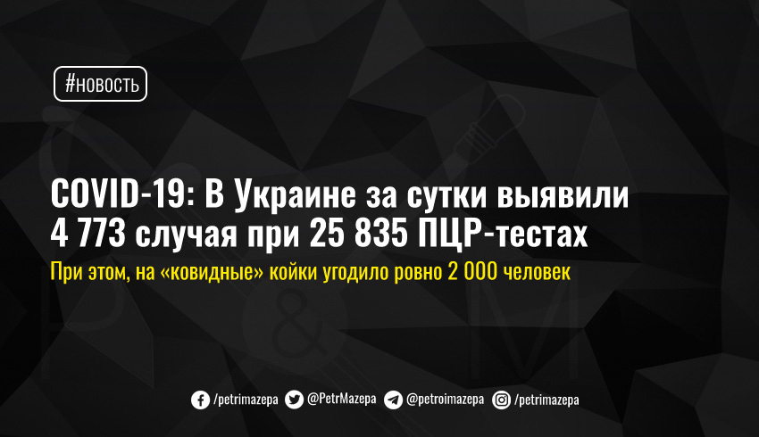 COVID-19: В Украине за сутки выявили 4 773 случая при 25 835 ПЦР-тестах