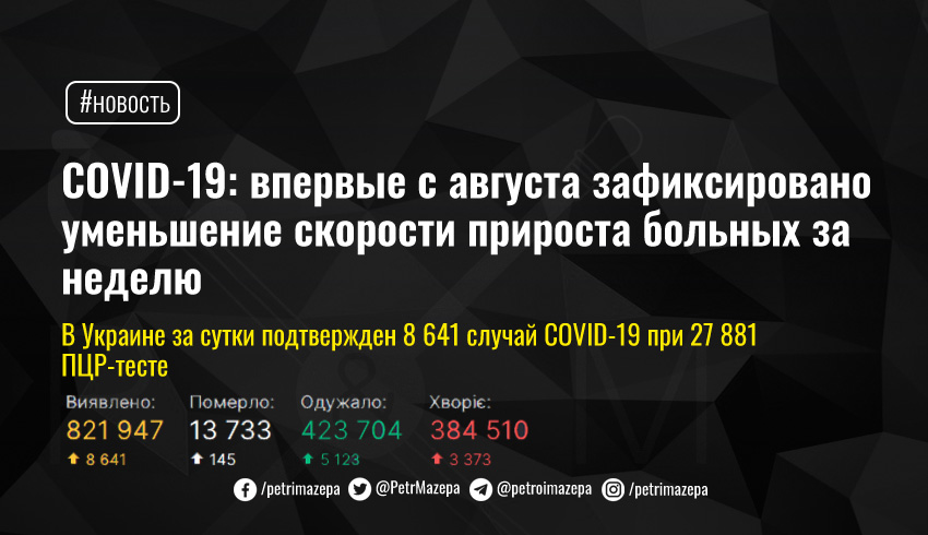 За воскресенье в Украине подтвердили 8 641 новый случай коронавирусной болезни COVID-19 (821 947 с начала пандемии). Летальных случаев вчера было 145 (13 733), а выздоровели 5 123 человека (423 704).