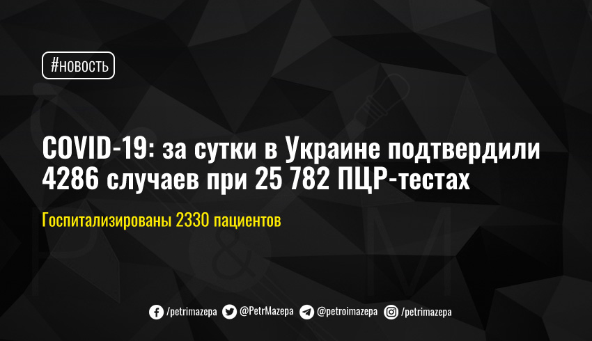 COVID-19: за сутки в Украине подтвердили 4286 случаев при 25 782 ПЦР-тестах