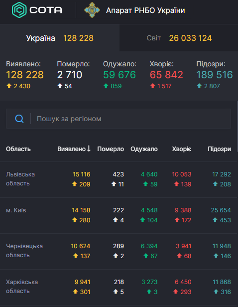 Всего за все время пандемии выявлено 128 228 случая COVID-19. Количество активных больных за сутки увеличилось на 1 517 человек и достигло 65 842 пациентов, сообщается на сайте СНБО.
