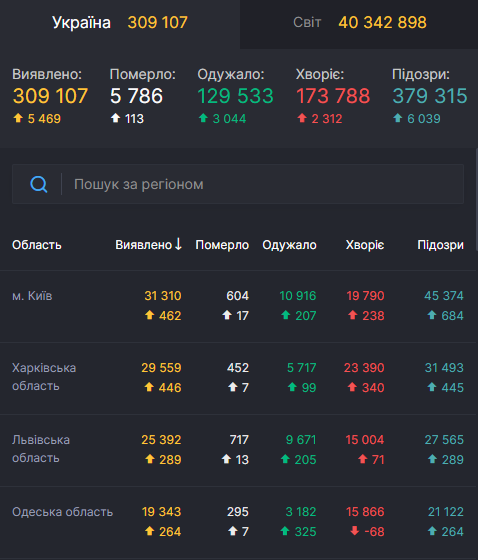 За 19 октября в Украине подтвердили 5469 случаев COVID-19. Общее количество подверженных с начала пандемии случаев составило 309 107.