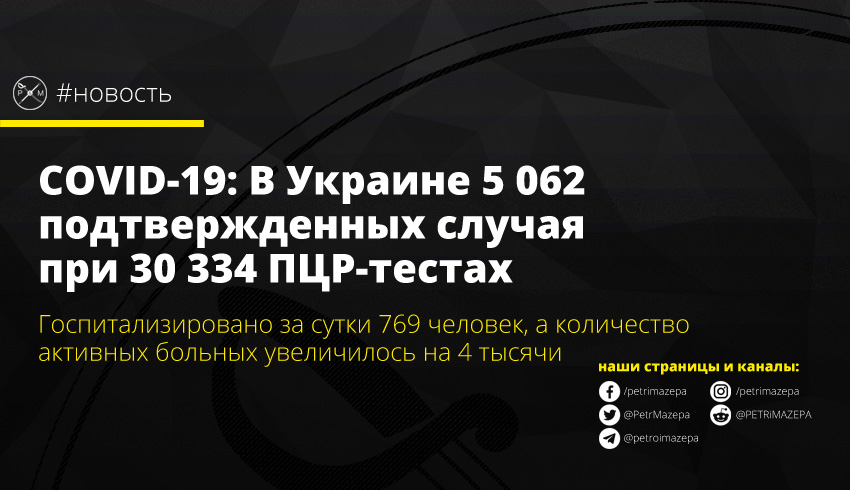 COVID-19: В Украине 5 062 подтвержденных случая при 30 334 ПЦР-тестах