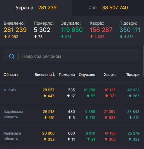 За сутки выздоровело 951 пациентов (всего 119 650 с начала пандемии), а 73 – умерли от осложнений (всего 5 302). Согласно данным СНБО количество активных больных за понедельник выросло на 4 038 и достигло 156 287 больных.