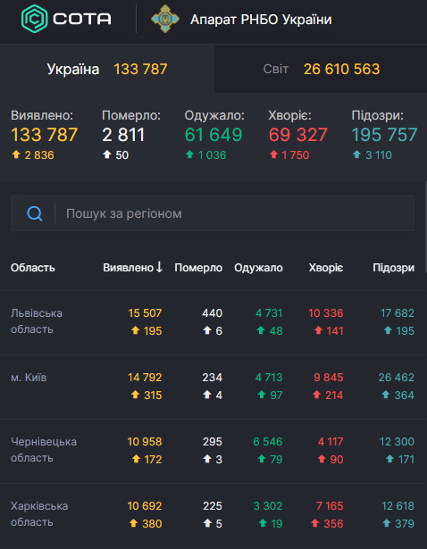 Всего в Украине с начала пандемии выявлено 133 787 случаев COVID-19. Количество активных больных за прошедшие сутки увеличилось на 1 750 человек и достигло 69 327 пациентов, сообщается на сайте СНБО.