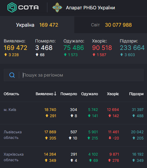 За 17 сентября в Украине подтвердили 3228 новых случаев COVID-19. Общее количество подтвержденных случаев достигло 169 472 человек.