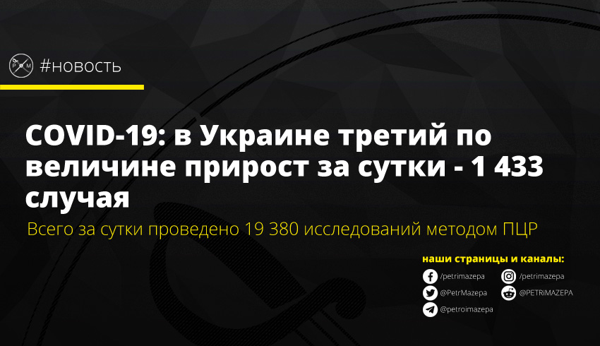 COVID-19: в Украине третий по величине прирост за сутки - 1 433 случая